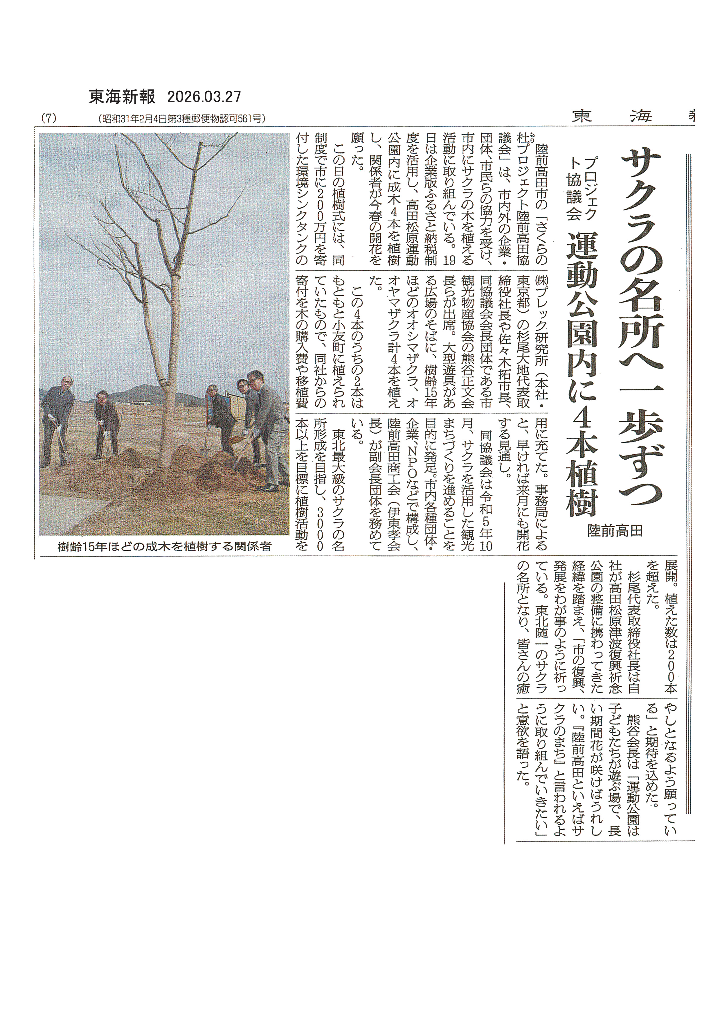 陸前高田市の「さくらの杜プロジェクト陸前高田協議会」は、 当社が昨年度「企業版ふるさと納税制度」で行った市への寄附金200万円を活用して、 高田松原運動公園内に樹齢15年程度のオオシマザクラ、オオヤマザクラ計4本を植樹しました。