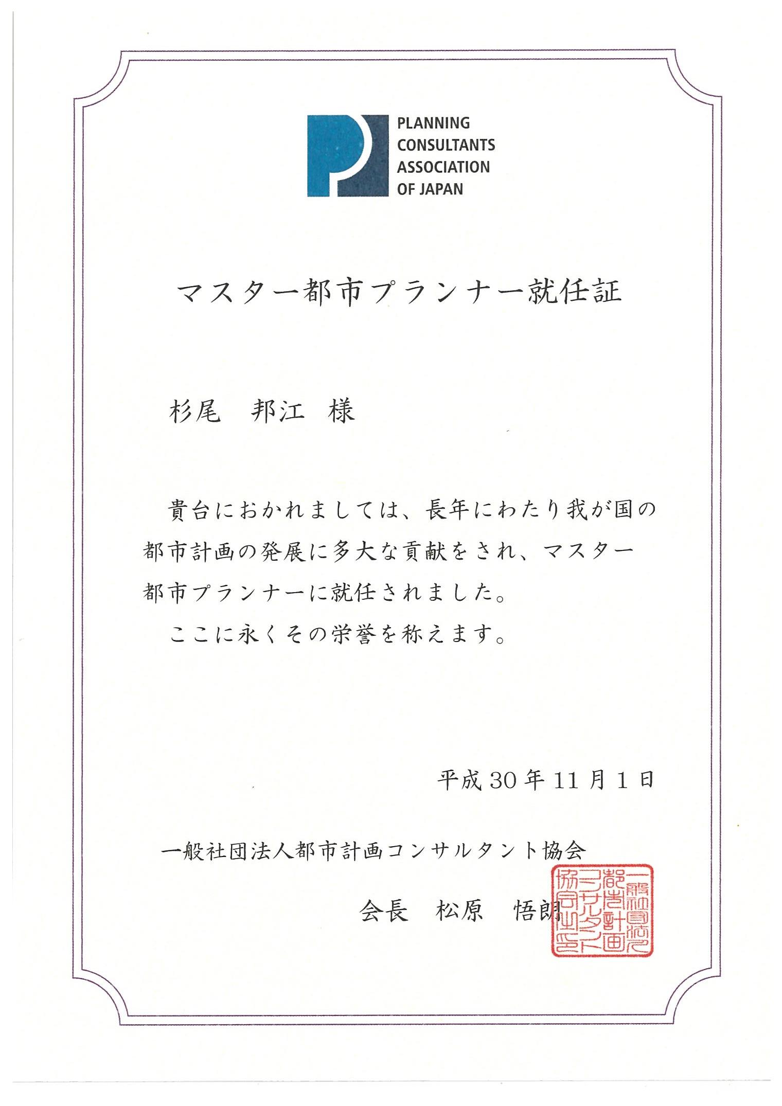 2018.11 お知らせ 「マスター都市プランナー」の認定を受けました。 当社代表取締役会長杉尾邦江が、長年にわたる我が国の都市計画の発展に多大な貢献を果たしてきた専門家として、一般社団法人都市計画コンサルタント協会より「マスター都市プランナー」に認定されました。