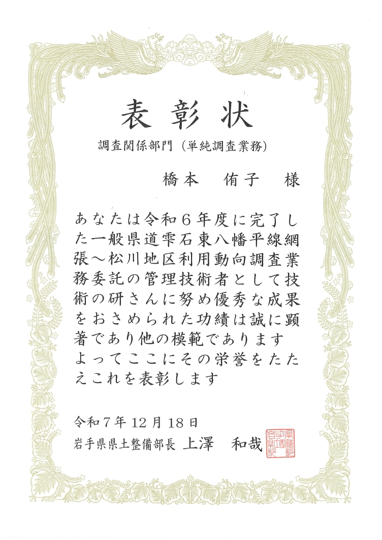 2025.12 表彰関連 岩手県県土整備部優良建設関連業務表彰を受賞いたしました。 岩手県県土整備部長より、「一般県道雫石東八幡平線網張~松川地区利用動向調査業務委託」に関して優良建設関連業務表彰を、 また管理技術者を務めた橋本侑子が優良技術者表彰を、それぞれ受賞いたしました。
