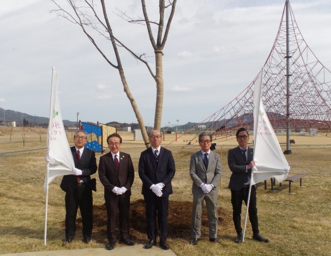 陸前高田市の「さくらの杜プロジェクト陸前高田協議会」は、 当社が昨年度「企業版ふるさと納税制度」で行った市への寄附金200万円を活用して、 高田松原運動公園内に樹齢15年程度のオオシマザクラ、オオヤマザクラ計4本を植樹しました。